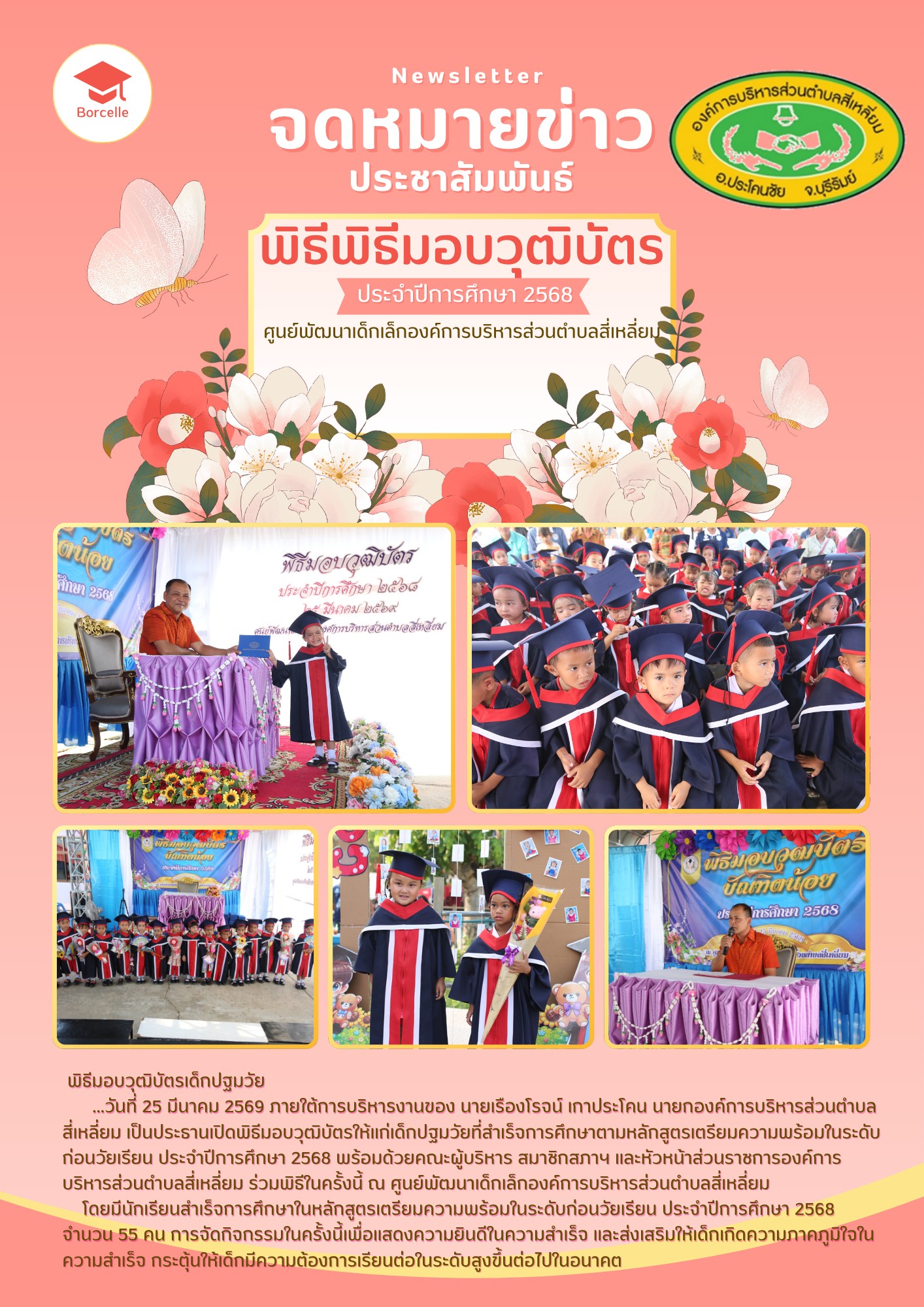 ...วันที่ 25 มีนาคม 2569 ภายใต้การบริหารงานของ นายเรืองโรจน์ เกาประโคน นายกองค์การบริหารส่วนตำบลสี่เหลี่ยม เป็นประธานเปิดพิธีมอบวุฒิบัตรให้แก่เด็กปฐมวัยที่สำเร็จการศึกษาตามหลักสูตรเตรียมความพร้อมในระดับก่อนวัยเรียน ประจำปีการศึกษา 2568 พร้อมด้วยคณะผู้บริหาร สมาชิกสภาฯ และหัวหน้าส่วนราชการองค์การบริหารส่วนตำบลสี่เหลี่ยม ร่วมพิธีในครั้งนี้ ณ ศูนย์พัฒนาเด็กเล็กองค์การบริหารส่วนตำบลสี่เหลี่ยม
